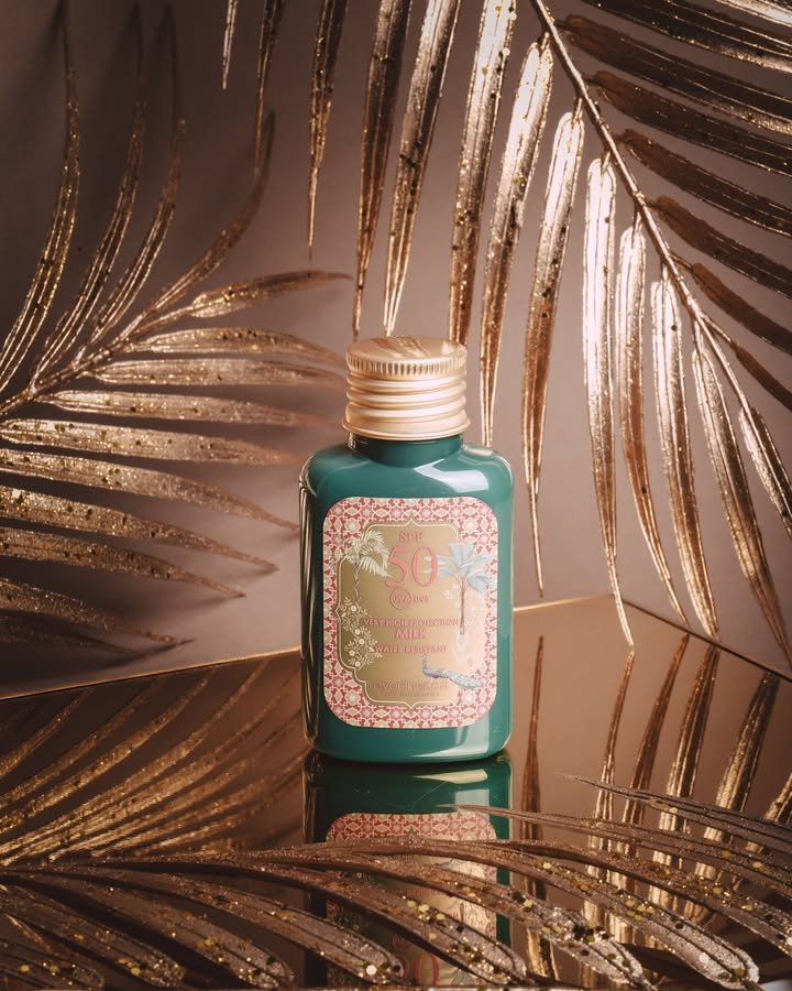 سواء على الشاطئ أو بجانب المسبح، استمتعي بحماية قوية مع إطلالة برونزية مثالية.